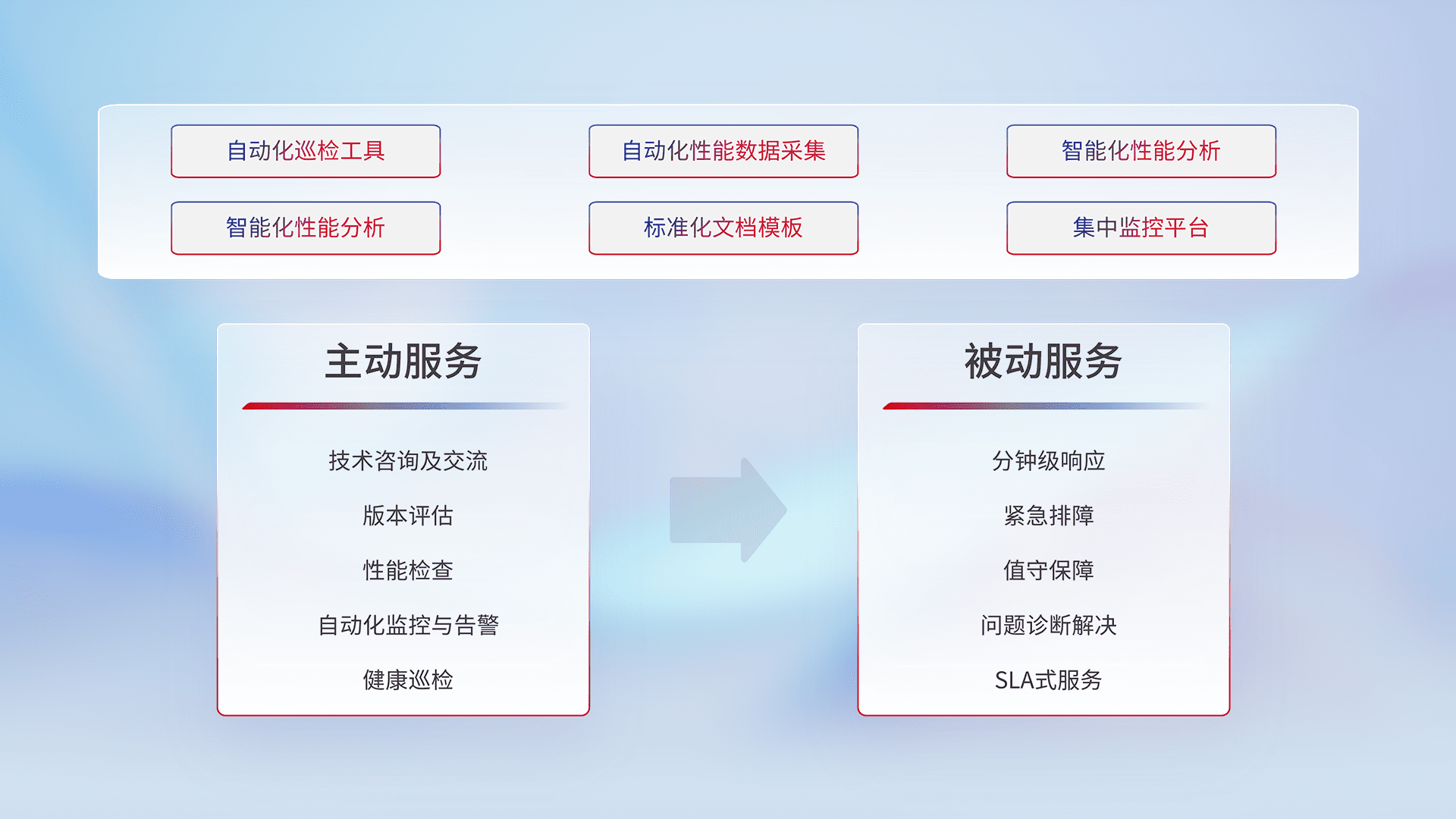 智能化工具和标准化文档,,,,保障服务质量,,,提供主动服务(包含技术咨询、、、、版本评估、、性能检查、、、自动化监控与告警、、健康巡检)和被动服务包含(分钟级响应、、紧急排障、、、、值守保障、、、问题诊断解决、、SLA服务)。。